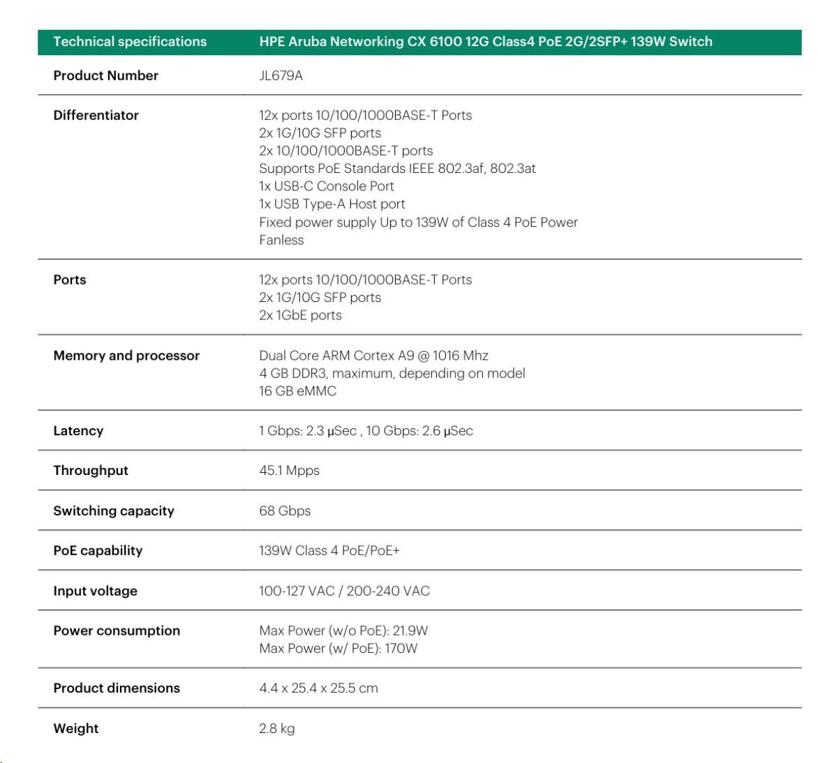 Aruba 6100 12G Class4 PoE 2G/2SFP+ 139W Switch JL679A RENEW