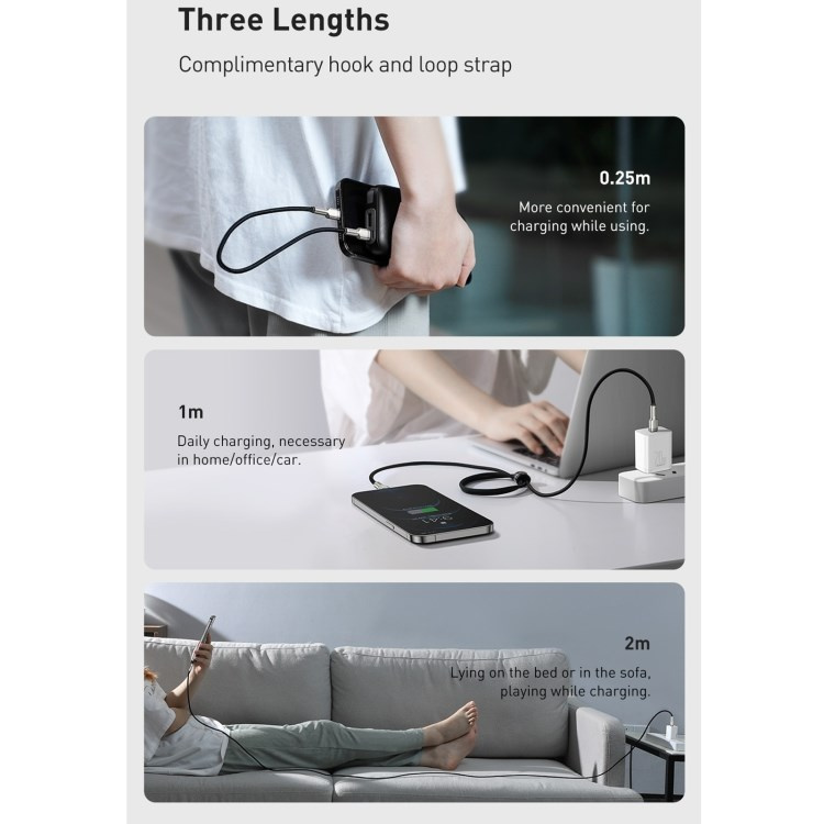 Flexibilní a odolný kovový kabel Baseus Cafule s konektory USB-C a Lightning vám umožňuje přenášet data a nabíjet baterii v zařízeních Apple.