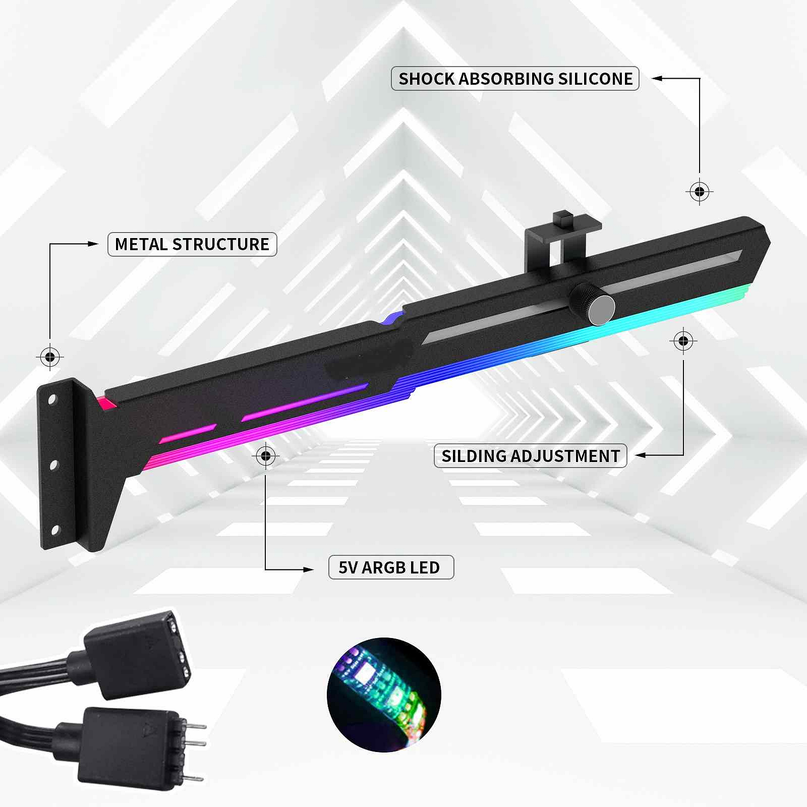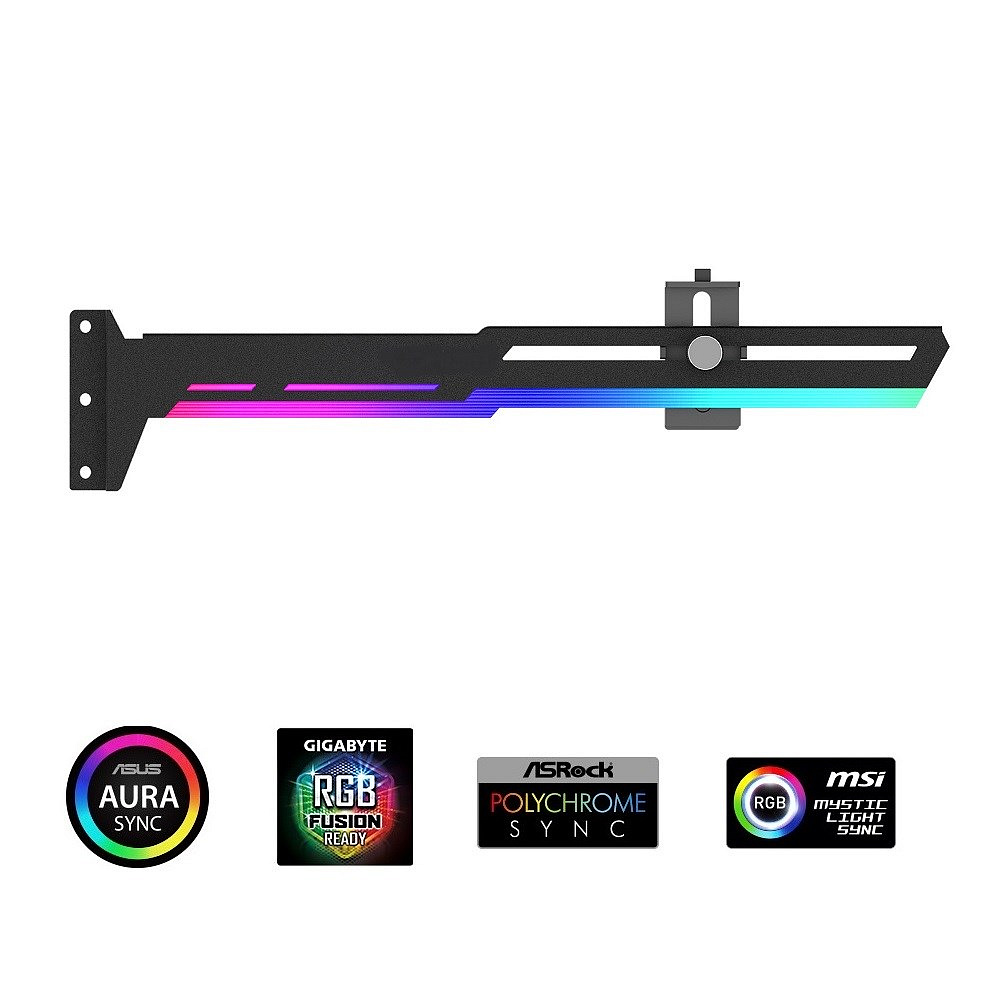 Stylová varianta této opory Vaší grafické karty je vyrobena z ocelového práškově lakovaného plechu a plastu, zabraňuje prohýbání větších karet ve slotu a dodává tak sestavě lepší celkovou stabilitu. Součástí je silikonová posuvná opora, kterou lze posunout jak horizontálně tak i vertikálně a umožňuje instalaci v různých místech karty, pro maximální kompatibilitu s většinou karet. Rozměry držáku jsou 280 x 52mm.