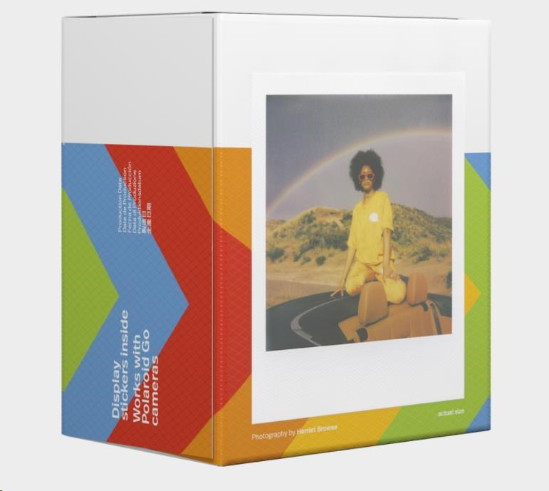 Každé balení obsahuje 16 barevných instantních fotografií s lesklým bílým rámečkem připravených pro světlo světa. Exkluzivně pro použití s fotoaparáty Polaroid Go. Velikost: 66,6 × 53,9 mm / velikost snímku: 47 × 46 mm Bílý rámeček ASA 640 Vyvíjení fotografie do 10–15 minut Nejlépe uchovávat v chladničce.
