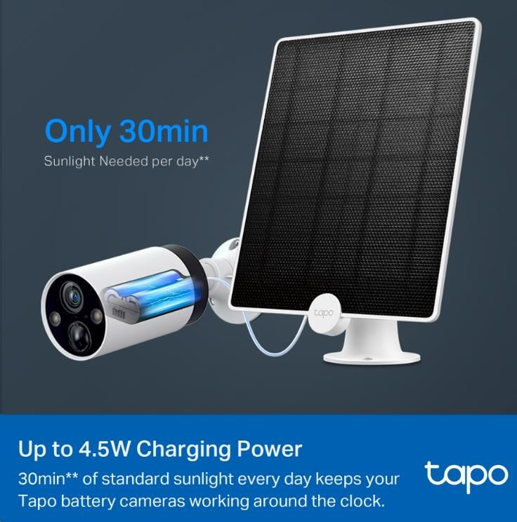 - Non-Stop Solar Power-Zachycuje bezplatnou, čistou sluneční energii a poskytuje nepřetržité napájení pro vaše kamery Tapo napájené bateriemi (Tapo C425, Tapo C420), aby vás chránily po celý rok.