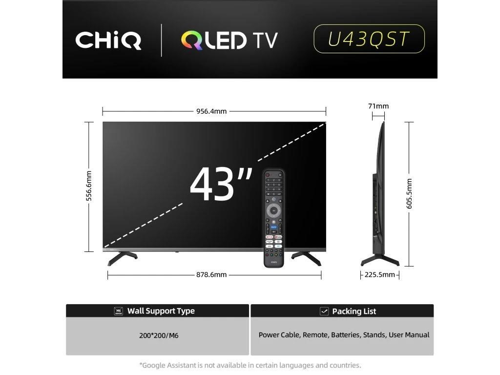 CHiQ 43“ U43QST, ultratenká metalická bezrámečková QLED Smart Google TV 5.0 s několika herními funkcemi, HDR10, HLG, obrazovkou s Ultra HD s rozlišením 3840 x 2160 pixelů, prostorovým zvukem Dolby Audio a dbx-tv.