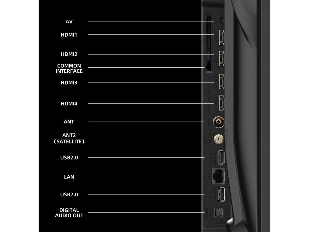 | Vstupy a výstupy: | AV vstup mini, CI+, digitální audio výstup, HDMI 2.1, USB 2.0, LAN, antény RF a LNB |