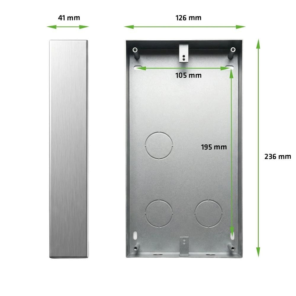 EVOLVEO DoorPhone ID MSB je kovový montážní box určený pro povrchovou instalaci venkovních jednotek DoorPhone ID1 a ID2. Umožňuje montáž bez nutnosti zapuštění do zdi, což je ideální řešení při rekonstrukcích, dodatečných instalacích nebo montáži na hotovou fasádu, plotový sloupek či betonový pilíř. Pokud nechcete sekat do omítky nebo řešit podomítkovou krabici, MSB nabízí rychlé a čisté řešení.