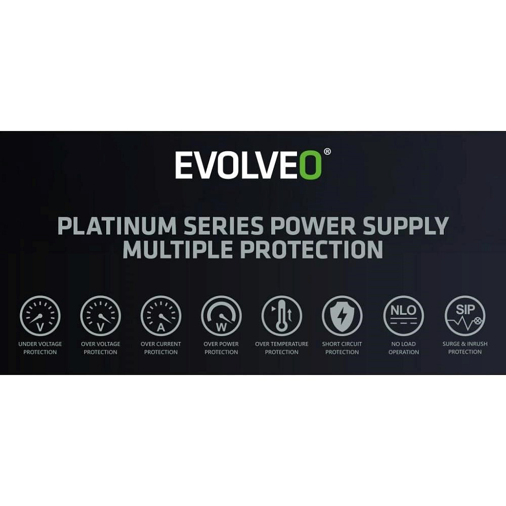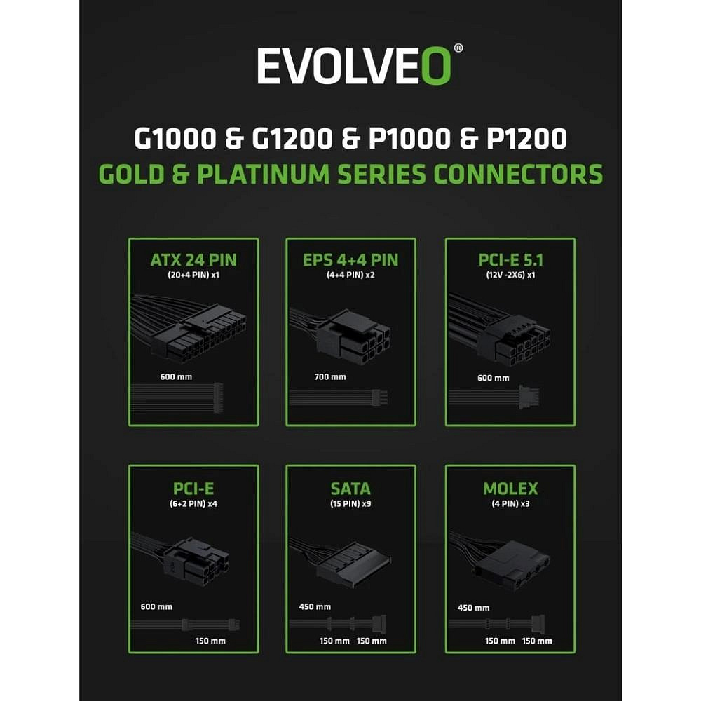 EVOLVEO P1200 zdroj 1200W, 80+ PLATINUM, ATX 3.1, aPFC, 140 mm ventilátor, 3 roky záruka, černý