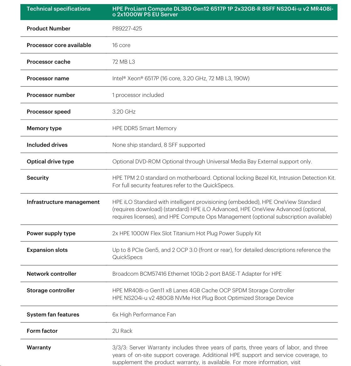 HPE PL DL380 Gen12 6517P (3.2/16C) 2x32G (P69727) NS204(2x480) MR408i-o 8SFF 2x1000W 10GbE NBD333 Smart Choice