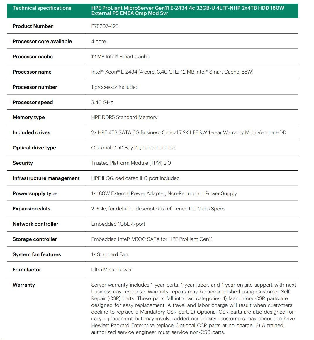Model Name | HPE ProLiant MicroServer Gen11 E-2434 4c 32GB-U 4LFF-NHP 2x4TB HDD 180W External PS EMEA Cmp Mod Svr |