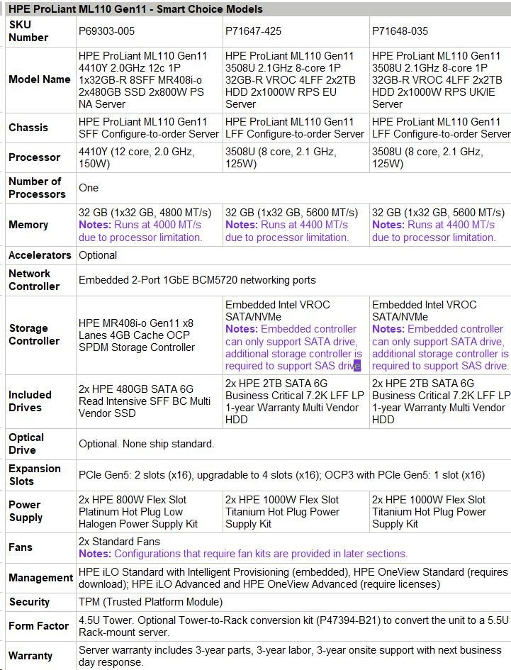Model Name | HPE ProLiant ML110 Gen11 3508U 2.1GHz 8-core 1P 32GB-R VROC 4LFF 2x2TB HDD 2x1000W RPS EU Server |