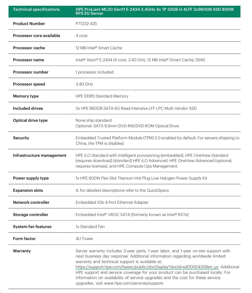 Model Name | HPE ProLiant ML30 Gen11 E-2434 3.4GHz 4c 1P 32GB-U 4LFF 2x960GB SSD 800W RPS EU Server |