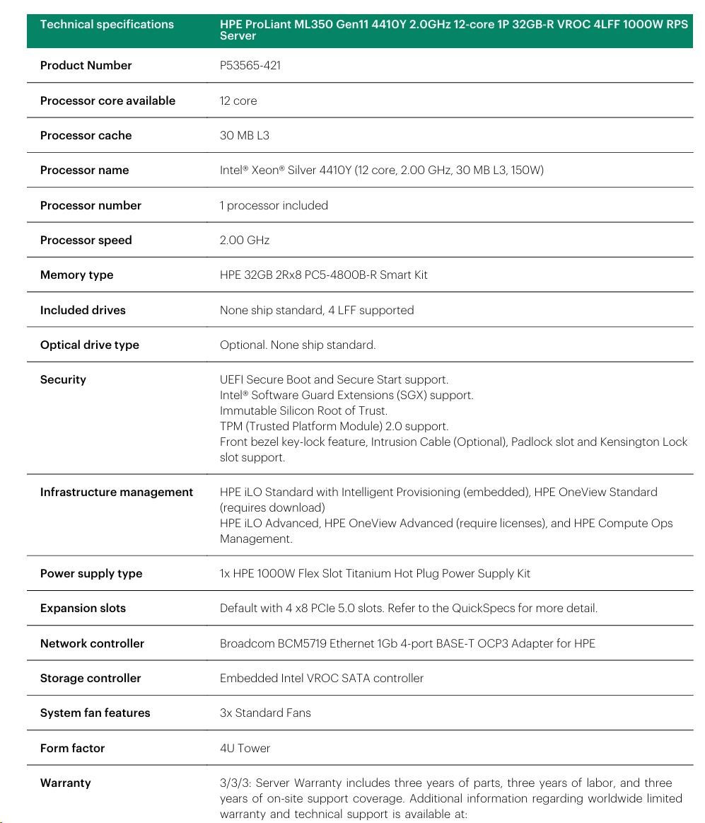 Model Name HPE ProLiant ML350 Gen11 4410Y 2.0GHz 12-core 1P 32GB-R VROC 4LFF 1000W RPS Server