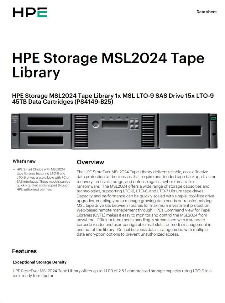 HPE Storage MSL2024 Tape Library 1x MSL LTO-9 SAS Drive 15x LTO-9 45TB Data Cartridges