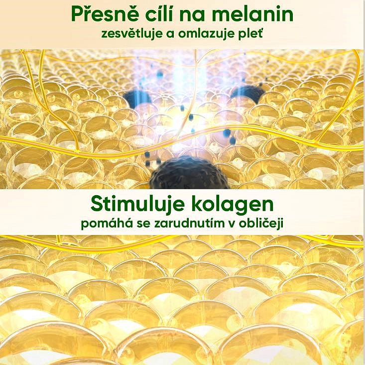 - Režim WHITEN (Bělení skvrn): Cíleně se zaměřuje na tmavé pigmentové skvrny, pihy a stopy po akné. Energie je pohlcena nahromaděným melaninem, který se teplem rozloží na menší částečky a tělo je následně přirozeně odbourá. Skvrny tak postupně blednou a stávají se méně viditelnými.