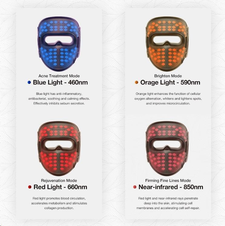 - Čtyři klinicky ověřené vlnové délky pro komplexní péči o pleť: modrá, jantarová, červená a blízká infračervená.