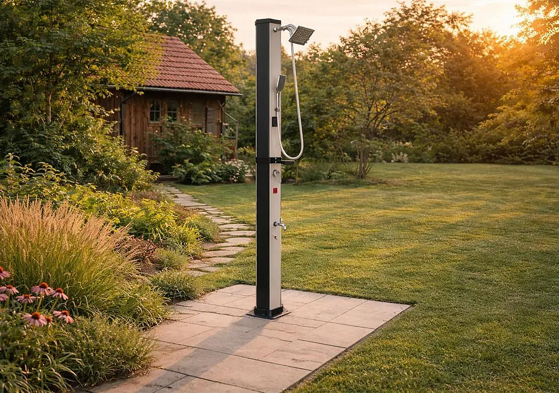 Solární sprchy se dají využívat samostatně, ale můžou tvořit i doplněk k bazénům. Pomáhají tak před zbytečným znečištěním bazénové vody například od trávy či hlíny.