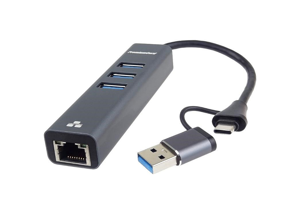 Převodník, který umožní připojit Váš počítač s portem USB typu C do internetu nebo k lokální síti pomocí kabelu s RJ45 a navíc umožňuje zapojit tři USB3.2 periferie jako USB disk, tiskárnu, klávesnici a myš