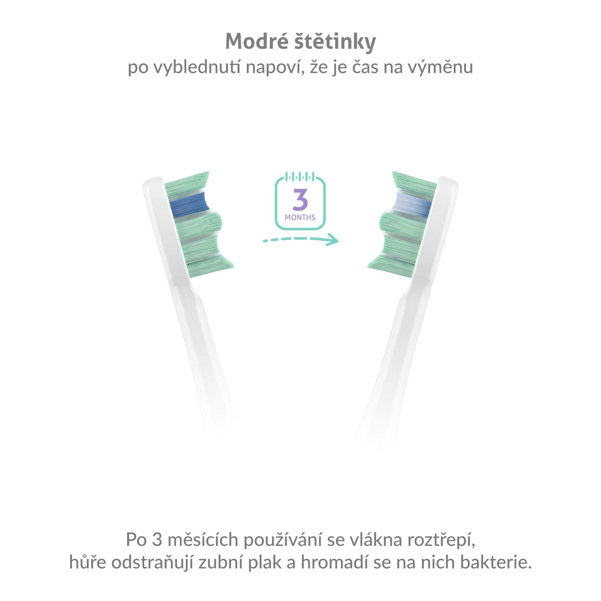 Opotřebené štětiny kartáčku se třepí, ztrácejí účinnost a hromadí se na nich bakterie. Hlavice sonického kartáčku jsou osazeny modrými štětinami, které po 3 měsících zbělají a upozorní vás tak na nutnost výměny.