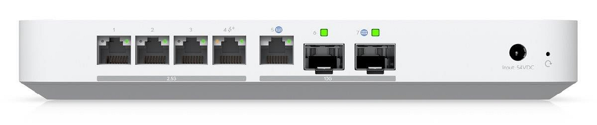 Popis produktu UXG-Fiber je kompaktní 10 gigabitový router, který disponuje (1) WAN 10Gbps portem, (2) 10Gbps SFP+ porty (1x WAN, 1x LAN) a (4) LAN 1/2.5Gbps porty s jedním PoE-OUT portem s podporou PoE+ 802.3af/at. Kompaktní, ale výkonné provedení tak podporuje funkci multi-WAN včetně možnosti load balancing, nechybí podpora IDS/IPS. Router má implementovanou podporu různých typů VPN, včetně site-to-site VPN. Napájení je řešeno prostřednictvím napájecího adaptéru 54V/1,1A, napájecí adaptér je součástí balení. Klíčové vlastnosti • 5Gbps routing s podporou IDS/IPS • (1) WAN 10Gbps + (1) 10Gbps SFP+ WAN • (4) 2.5Gbps LAN + (1) 10Gbps SFP+ • Multi-WAN + load balancing • Podpora VPN, včetně site-to-site VPN Obsah balení • Zařízení • Patch kabel • Napájecí adaptér 54V/1,1A Technické parametry Konektory a rozhraní Rychlosti WAN:(1) 1/2.5/10Gbps + (1) 10Gbps SFP+ Možnost více WAN:Ano Rychlost LAN:(4) 10/100/1000/2500Mbps Gigabit LAN:Ano Optické rozhraní:(2) 10Gbps Napájení Typ napájení:DC konektor Typy PoE:PoE-Out (pouze) Podporované PoE-Out standardy:802.3af, 802.3at Počet PoE Out portů:1 Max. spotřeba energie [W]:25 Napájení přes konektor/svorkovnici:54V / 1,1A Fyzické charakteristiky Provedení:Desktop Šasi:Plastové Tlačítka:Reset Provozní teplota [°C]:0 až 40 Hmotnost [g]:605 Šířka [mm]:213 Výška [mm]:30 Hloubka [mm]:128 Hardware CPU:ARM Cortex-A73 Frekvence CPU [MHz]:2200 Počet CPU jader:4 RAM [MB]:2048 Software Podporované VPN:L2TP, IPSec, OpenVPN, WireGuard Management:UniFi Network Podpora IPv6:Ano.