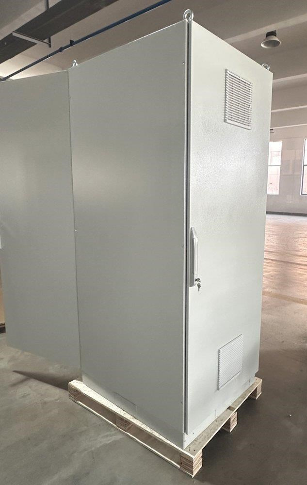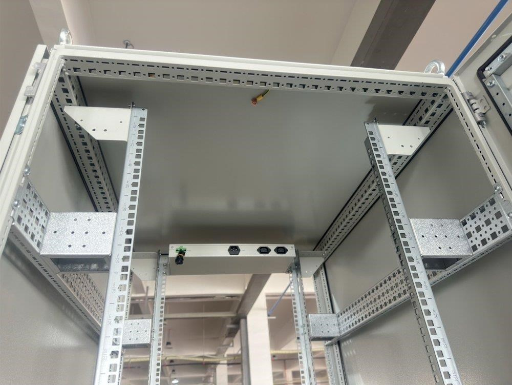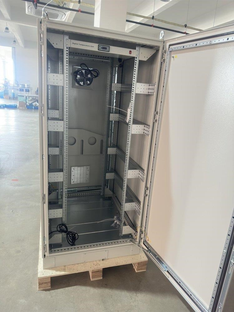 Rozvaděč pro instalaci datových a telekomunikačních zařízení, ventilace s termostatem, podstavec, šedý.
